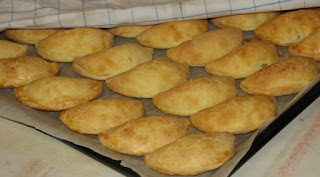 Vaivaa taikinaa vielä hetki jauhotetulla pyödällä, katso että taikinan alla on tarpeeksi jauhoa ennen kuin kaulitset. Kaulitse taikina noin puolen sentin paksuiseksi levyksi ja ota siitä joko muotilla tai vaikka jälkiruokakulhon avulla pyöreitä levyjä. Laita täyte taikinalevylle ja painele reuna hyvin kiinni. Voitele täytetyt pasteijat kananmunalla ennen paistoa. Paisto 225 asteessa noin 15min (tai kunnes pinta sopivan ruskea).