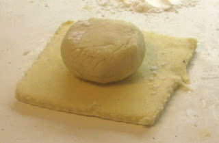 Alla vielä kuva, jossa näkyy pullataikinasta tehty pulla ja kuoritaikinan pala. Kuoren reunat nostetaan tuohon pullan päälle ja pulla käännetään oikeinpäin niin, että saumat jäävät pullan alle.