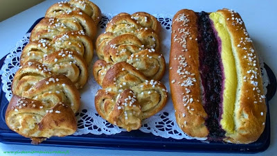 Täytepitkot onnistuvat mainiosti myös gluteenittomasta pullataikinasta. Oikean puoleisessa pitkossa on täytteenä itse tehtyä kuningatar-hilloa ja Sallisen vaniljakreemijauheesta tehtyä kreemiä (ihan purkin ohjeen mukaisesti). Pitkossa on myös sisällä hilloa. Vasemmanpuolinen ja keskimmäinen pitko puolestaan saa makunsa kotitekoisesta omenahillosta ja tuosta samasta vaniljakreemistä. Ne on valmistettu levittämällä täyte suorakaiteeksi kaulitulle taikinalle, joka on rullattu tiiviiksi rullaksi ja tämän jälkeen rullaan on leikattu saksilla viillot sekä käännelty näin saadut taikinaosiot vuoroin vasemmalle, vuoroin oikealle. Tähän löytynee netistä neuvoja kuvien kera, itse en tullut kuvia ottaneeksi jauhoisin käsin :) Alla vielä vanha tuttu pullataikinaohje, jolla nämä tein. Yhdestä taikina-annoksesta tulee 2 pitkoa.