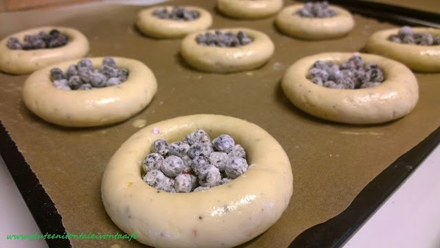 mustikat ja perunajauho kulhossa. Voitele pullat ja lisää täytteeksi