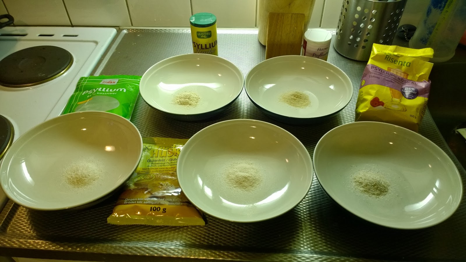 Facebookin puolella käytiin keskustelua siitä, onko erimerkkisissä psylliumeissa eroja. Olen itse aiemmin käyttänyt Farinan psylliumia (jota Vuohelan Herkku pakkaa), mutta viime aikoina olen ostanut Finaxia, kun se myydään isommissa pakkauksissa ja on hinnaltaan hieman halvempaa. Joskus vuosia sitten olen käyttänyt satunnaisesti myös FiberHusk -nimellä myytävää psylliumia. Olin itse keskustelussa sillä kannalla, että psylliumeissa ei ole merkittäviä eroja, mutta nyt joudun toteamaan, että kyllä niissä voi olla. Noiden aiemmin mainittujen lisäksi testiin pääsivät Risentan sekä Virtasalmen viljatuotteen psylliumit. Tuota Virtasalmen Viljatuotteen psylliumia eräs keskustelija kehui kovasti, joten kävin aivan asioikseni ostamassa kyseistä tuotetta Kuopion TullinTuvasta, sillä ainakaan täällä en ole kyseistä tuotetta tavallisten ruokakauppojen valikoimissa nähnyt.